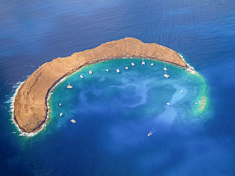Snorkel at Molokini Crater, a crescent-shaped volcanic islet just off Maui’s south shore. Crystal-clear waters reveal colorful coral reefs and a dazzling array of tropical fish, making this marine sanctuary one of Hawaii’s best underwater adventures.